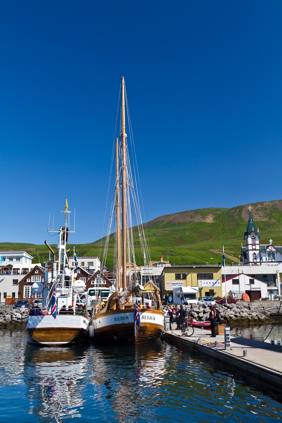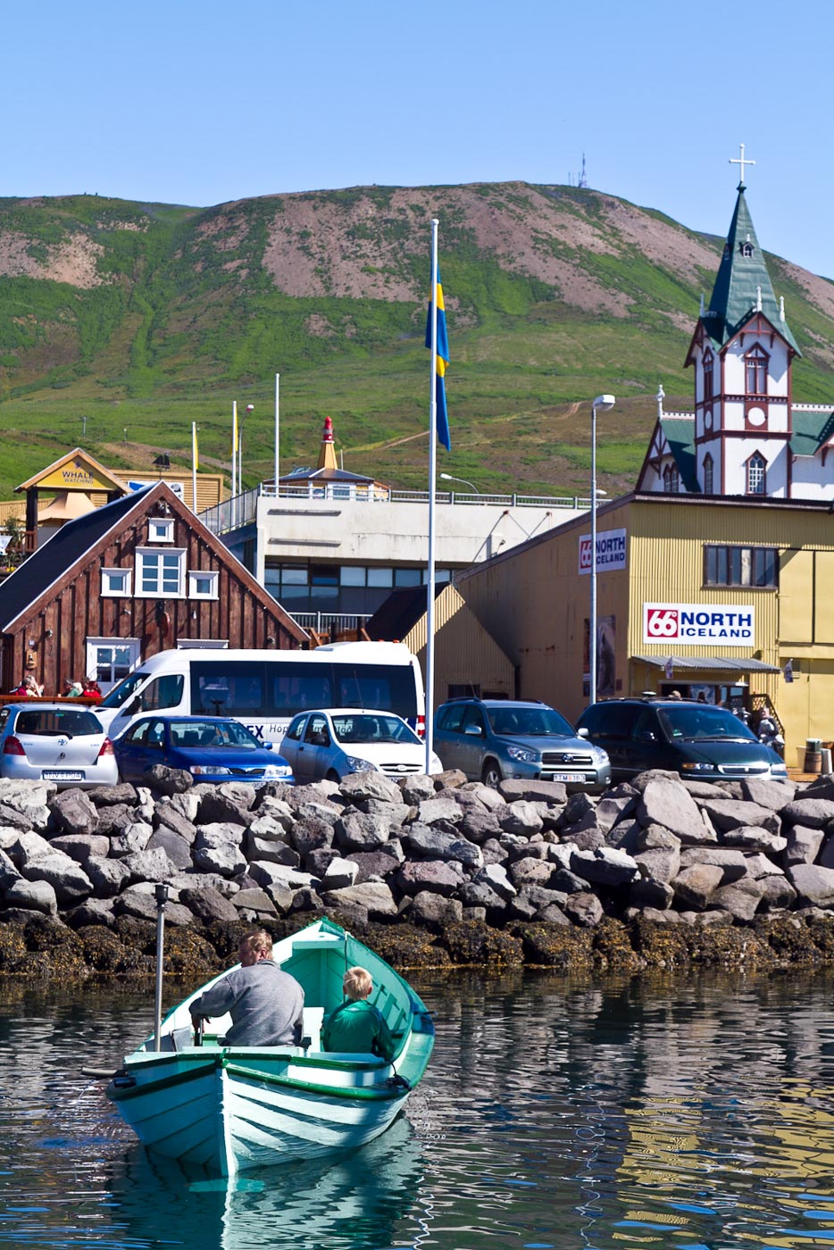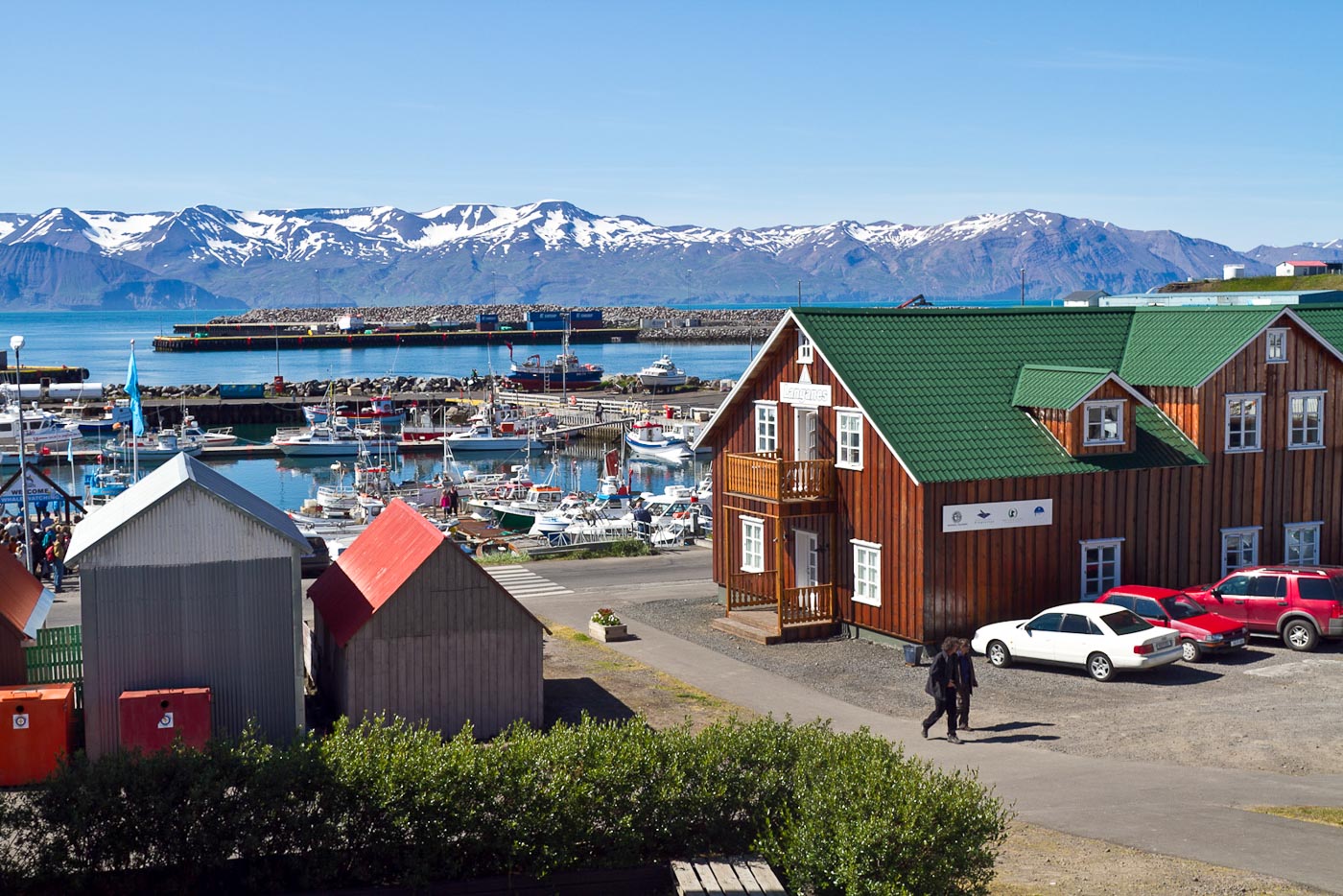 Mesto Húsavík leži na vzhodni obali zaliva Skjálfandi (Skjálfandi pomeni tresoč), ki je znan kot prestolnica kitov na Islandiji. V zadnjih letih so bili kiti opaženi na 98 % vseh turističnih izletov. No, kite in njorke smo tudi videli, ni bilo pa tako spektakularno kot sem si predstavljal. Húsavík je tudi mesto prve hiše na Islandiji, ki jo je leta 860 zgradil švedski viking Garðar Svavarsson ter faličnega muzeja.