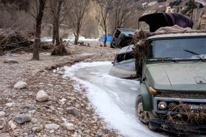 We start walking at quite popular summer spot, which has seen a lot of construction in the last years. They built summer houses, and i have to admit that everything looks a bit chinese kitschy and not very attractive to me. But it could be an option to cool off from the summer heat. This first part is actually quite un-interesting as everything that surounds you is grey and road is quite boring. After almost 2km we finally arrive closer to river – to a spot where we can remains of the last year floods. Plenty of cars (now frozen in water), even bus is there. River was really high and strong to bring all of this. Unfortunately there are also plastic bags on almost every bush or tree. Yep, river was high. The shores of this river are also popular with movie crews – there are plenty leftovers of movie sets. They build whole villages (just fronts), apparently they filmed also a movie about ancient paitings in caves. And there are some trees with bright green plastic leaves. Its interesting that nobody told them to clean up, i guess that was out of options… so everything is still here. Including all the trash.