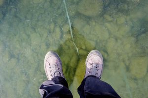 We have to cross the river several times, mostly over quite thick ice. It looks like it is around 15-20cm thick on most parts – of course not everywhere is safe to walk over it. And on some places its completely transparent, so you can observe rocks and fish (yes, swimming!!!) under the ice. The mini-crampons that we were given at the start i used only once, i decided not use them – it was more fun not to. On several parts river was completely frozen, just because it is winter, everything was completely grey (and a bit brown) around the river. So contrast with white river was strong 😉
