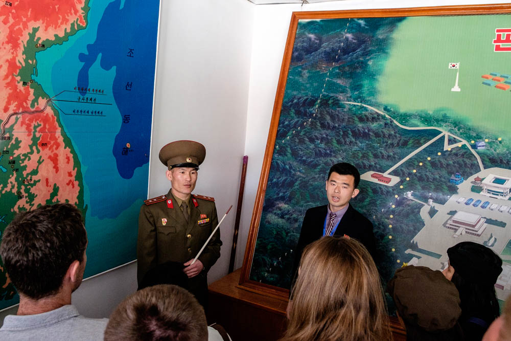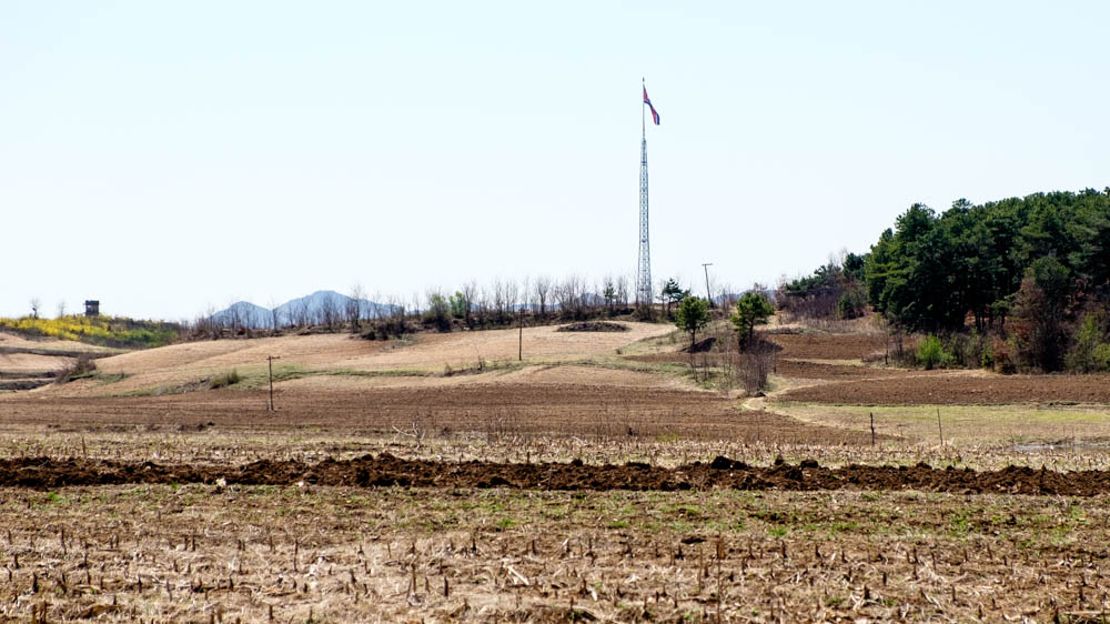 Iz Pyongyanga na jug pelje široka, praktično prazna cesta. Ne bom tudi rekel dobra, saj to ni – kljub pomanjkanju prometa je očitno slabo narejena (vzdrževana) saj je vožnja v avtobusu zelo tresoča. Pokrajina je izredno enolična. Praktično nič dreves, zelo pusto. Po približno 150km in treh urah vožnje se približamo mestu Kaesong (ki je bil zgodovinska prestolnica starodavne Koreje), avtocesta pa se konča tik pred začetkom demilitariziranega območja. Seveda na območje ni mogoče kar tako vstopiti. Ker je to vojaško območje so bile tudi procedure temu primerne, a mi kot turisti, nismo imeli birokratskih opravkov. Čas smo si lahko krajšali v bližnji trgovinici s spominki ali pa na WCju, ki ima verjetno najboljši pogled na DMZ. Ja, WC z razgledom. Fotografiranje vojakov, zidu in karkoli je dišalo na vojsko je bilo seveda prepovedano in večkrat poudarjeno.