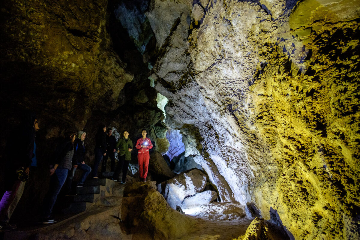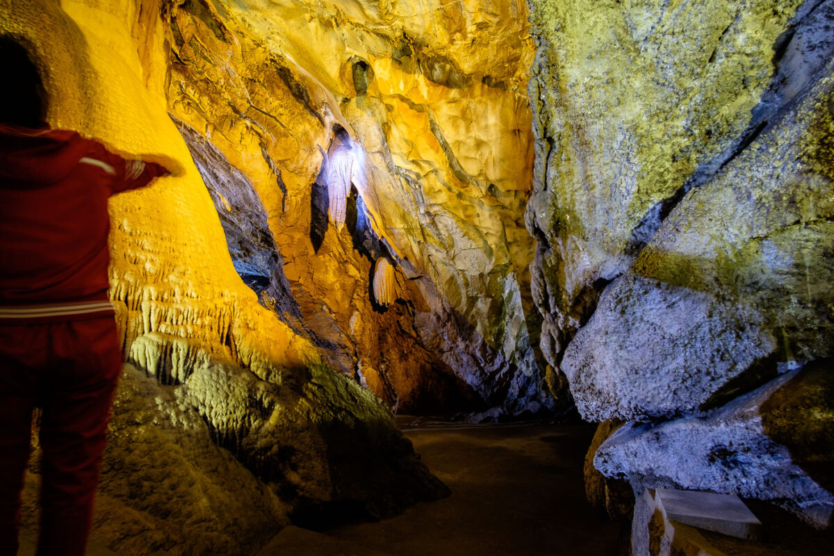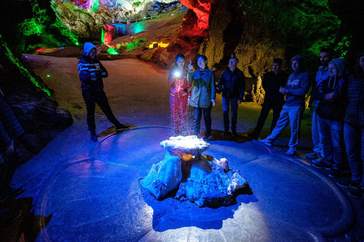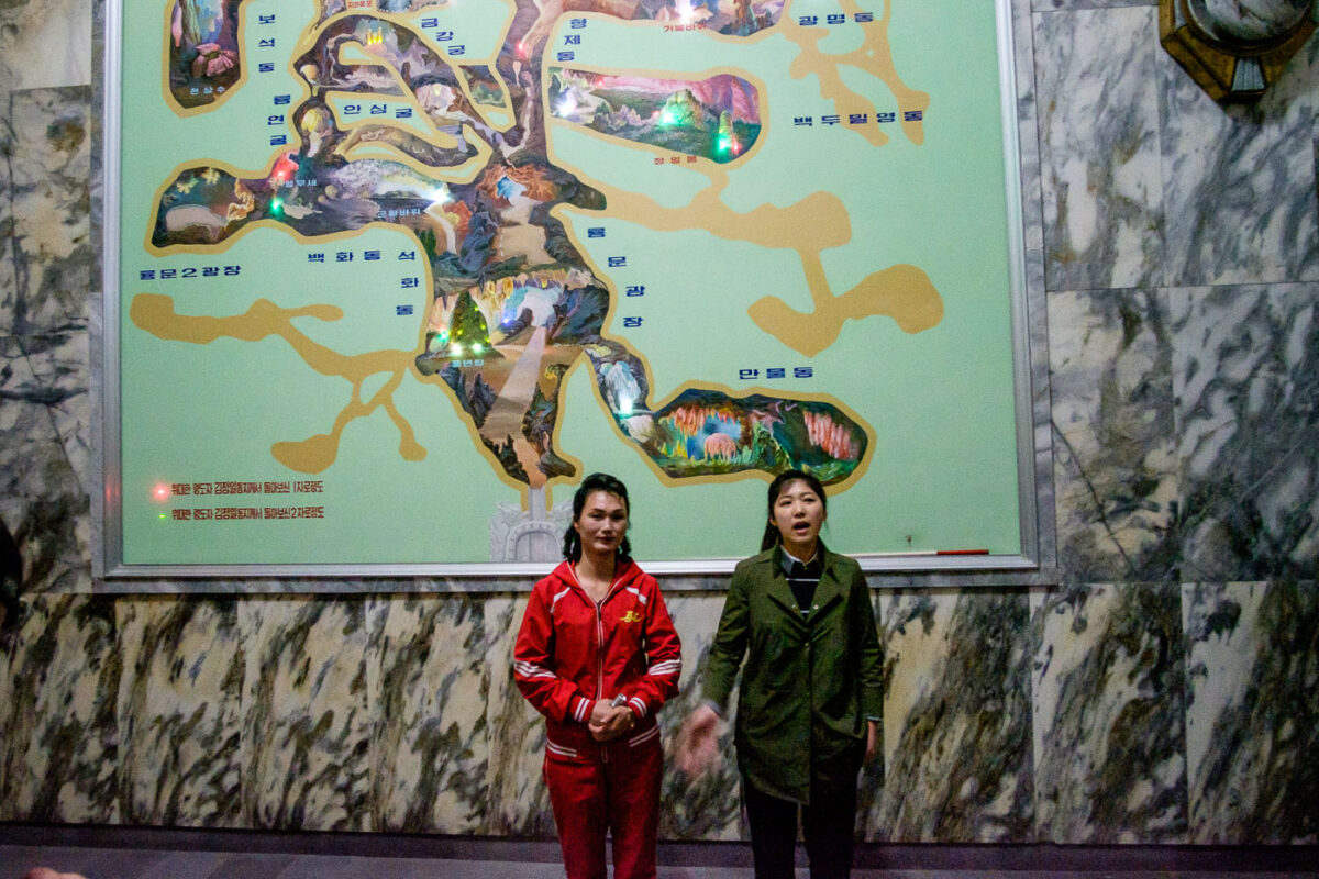 Naša vodička je bila oblečena v rdečo trenerko, ki je bila pravzaprav veliko nasprotje zelo lepo urejenim vodičem v Pyongyangu. Ne glede na to je bila super – polna “zanosa” in “ponosa”, njene razlage so bile polne simbolike in hkrati tudi rahlo “nekorektne”. No, vse to sklepam, ker ni znala niti besedice angleško. Ampak z mahanjem je pokazala svoj zanos, našo severnokorejsko vodičko pa je večkrat spravila v zadrego (ki jo je pokazala s tem, da je lepo zardela). Ampak ja, presenetljivo (in od teh jam res nisem pričakoval veliko) je bil obisk super. Raznolike formacije, veliko simbolike, podzemni slap,… Vse to je dopolnjevala zelo živa in barvna osvetlitev. No, hkrati se je vodička premikala kar hitro (jame so velike) in je zelo vestno in sproti ugašala luči. In parkrat je polovica skupine obtičala v temi 🙂