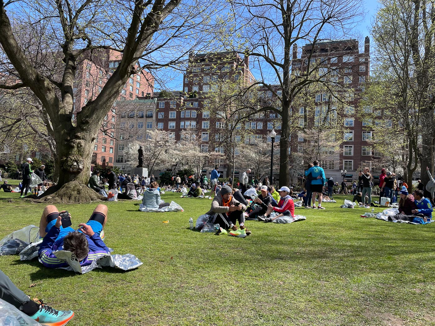 Štart maratona je v kraju Hopkins, 42km stran od cilja. In zanimivo, to je eden izmed redkih maratonov, ki ni v nedeljo, ampak se dogaja na ponedeljek – t.i. Patriots day, ki se je letos sovpadel še z veliko nočjo. Zjutraj se je bilo treba malo organizirati, ampak super je bilo dejstvo, da je od hotela direkten tramvaj in ni treba nekje še prestopati. Poleg tega je bilo zjutraj mraz, le nekaj stopinj nad ničlo, tako da je bilo vprašanje kaj obleči. Z Urošem sva imela v prijavi naveden čas malo pod 3h5m, on je bil sicer ene 2 minuti hitrejši. Kljub temu sva imela različne štarte, on v prvem valu ob 10:00, jaz v drugem ob 10:25. Okoli 7:30 sem oddal prtljago na ciljnem prostoru in se odpravil proti avtobusem. In tam se je gužva šele resno začela, tako da sem prišel na bus šele malo po 8:15. Na srečo je bil timing odličen, saj smo prispeli eno uro kasneje in mi ni bilo treba predolgo zmrzovati v hladnem, a sončnem jutru. Na prostoru, kjer so nas spustili iz avtobusa je bilo ogromno ljudi in pred WCji so se vile dolge vrste. Točno ob 10:00 so tudi nas spustili proti štartnemu prostoru in takrat si se lahko sprehodil po ulicah Hopkinsa – domačini so sedeli na verandah in pred hišami, nekateri so pripravljali barbecue… Tik pred štartnimi boksi je bil še en ogromen prostor z WCji (pomembno) in glej ga zlomka… tukaj ni bilo čisto nobene gužve. Odlično. Znotraj drugega vala smo bili razporejeni v štartne boxe in vsak se je postavil v svojega, tako da večje gužve res ni bilo.