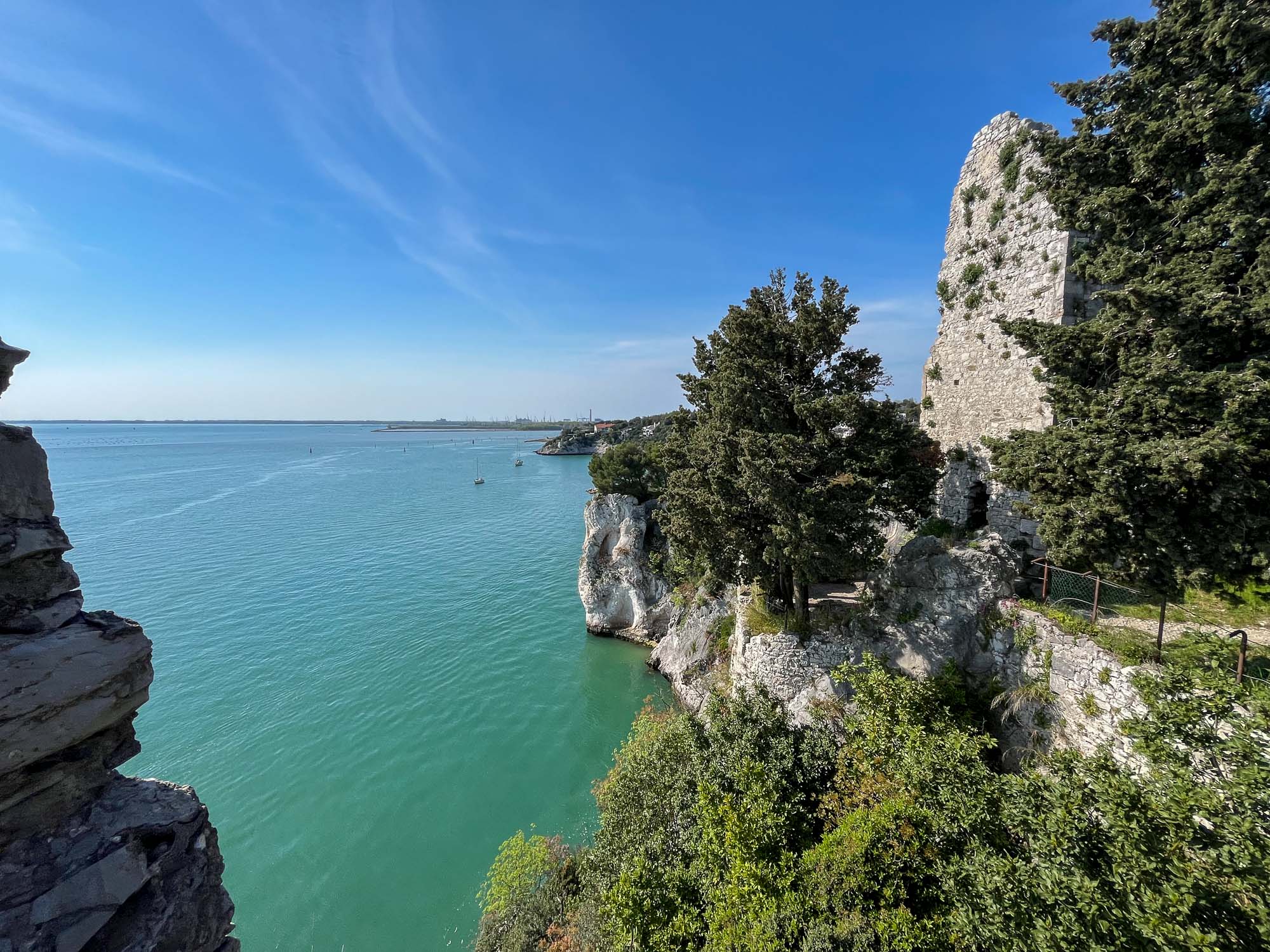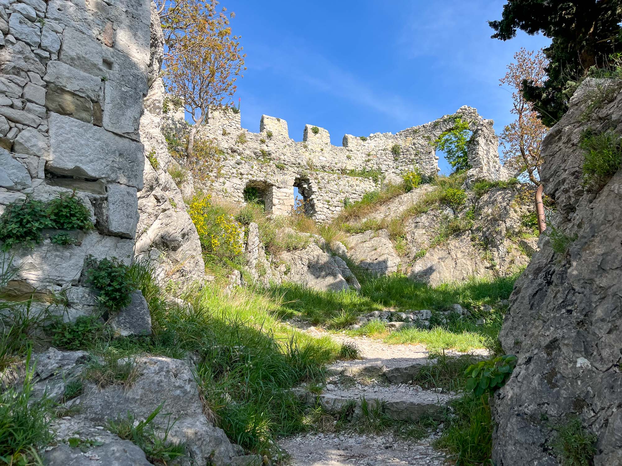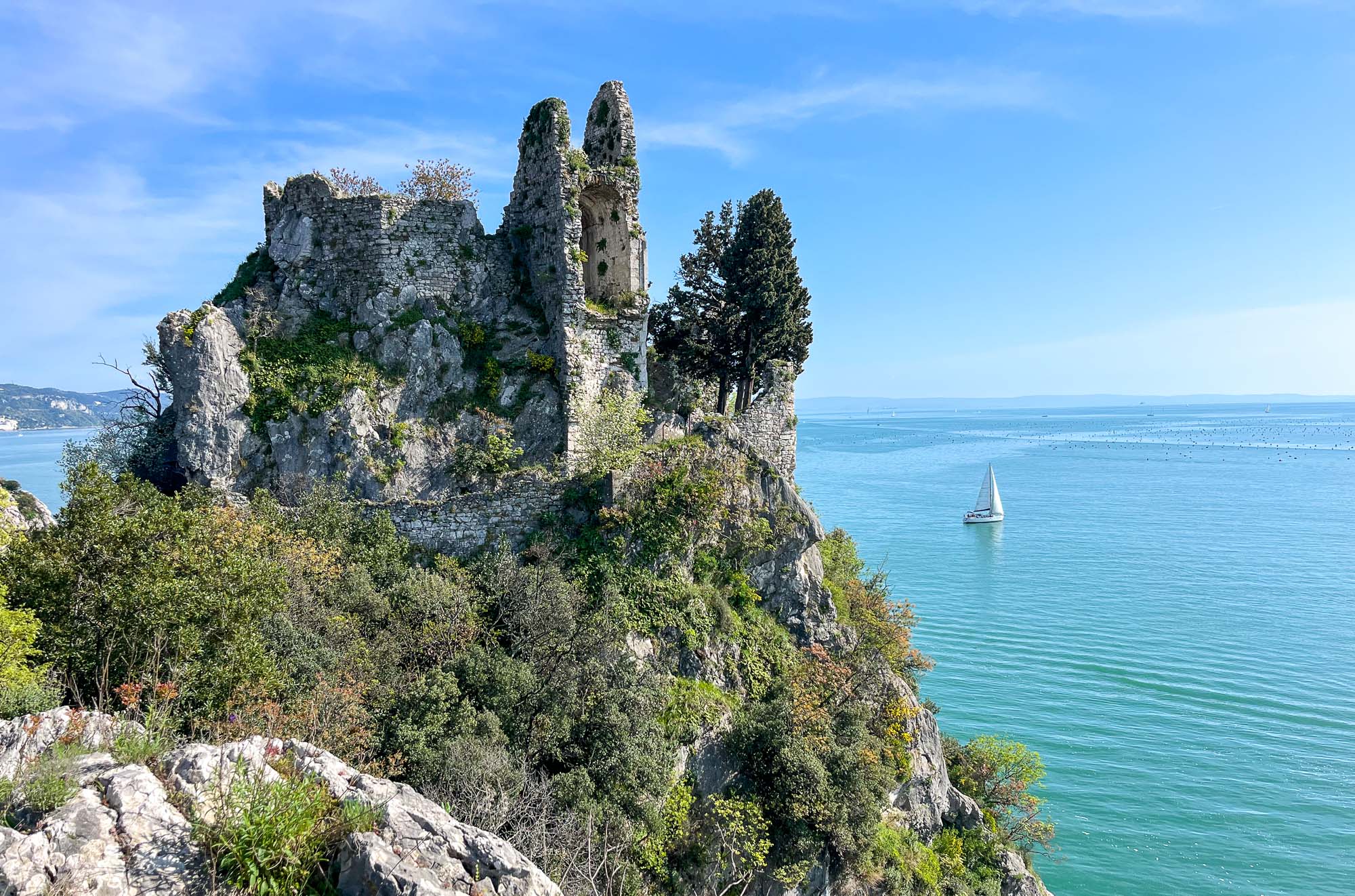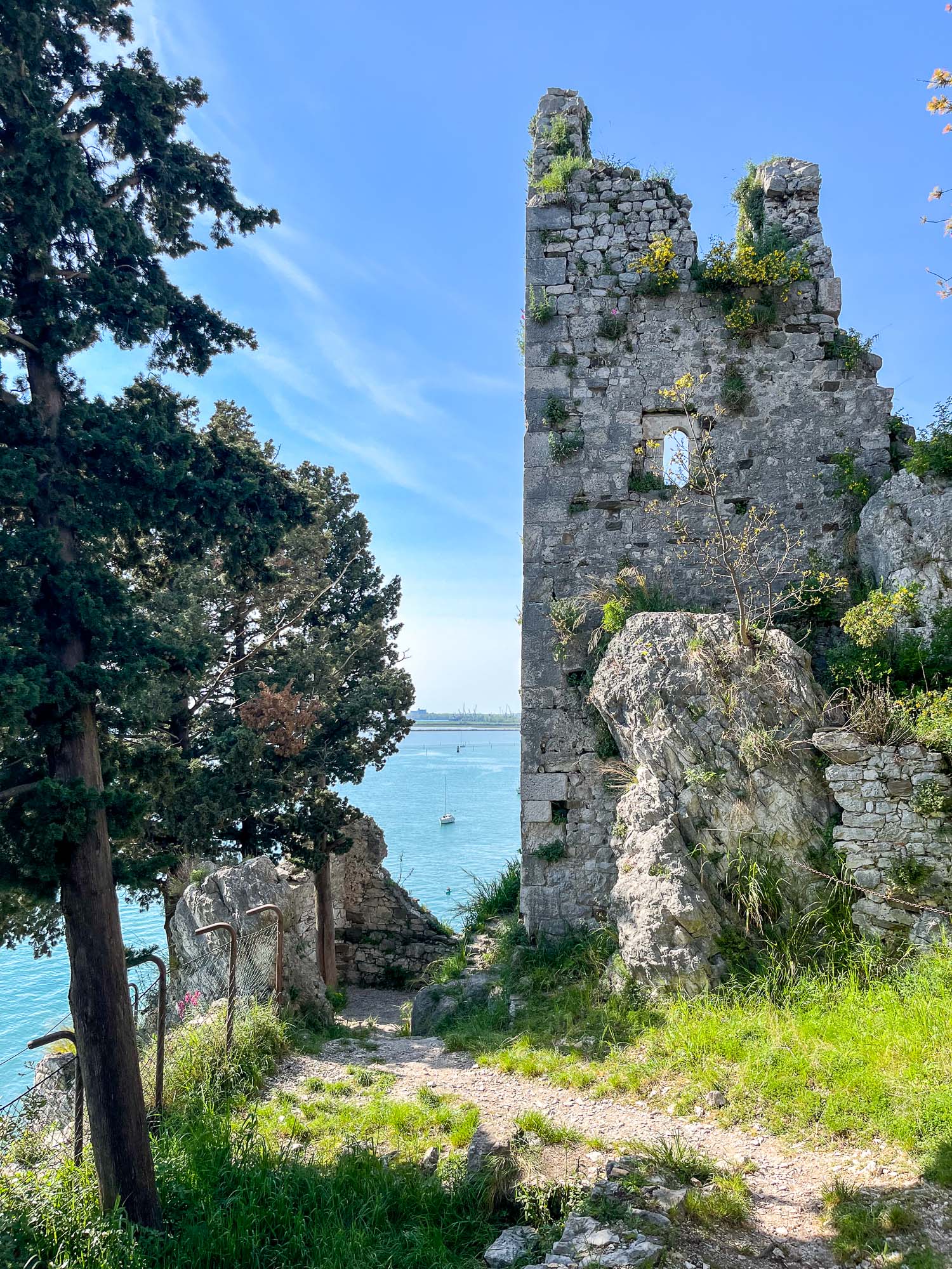 V bližini so tudi ruševine starega devinskega gradu, katera nastanek sega v 11. stoletje. Do gradu je vodila ena sama težko prehodna utrjena pot, speljana vzdolž obzidja. V 14 stoletju je bila utrdba povezana z oglejskimi patriarhi iz družine della Torre, ki so začeli tudi graditi nov grad na rimskih ruševinah. Danes so tukaj več ali manj samo ruševine, saj naj bi ga v 14. stoletju porušili turki, graščaki pa so se dokončno preselili v novi devinski grad. Po eni teoriji naj bi bil ta grad namenjen čaščenju boga Sonca in se ga, romantično, imenuje tudi Bela dama… No, ima pa ta Bela dama tudi drugačno legendo, ki je povezana z graščakinjo, ki jo je ljubosumni mož pahni skozi okno v morje. Padla je na skale, okamenela, njen duh pa naj bi se še danes vračal v grad. In se ta skala imenuje Bela dama.