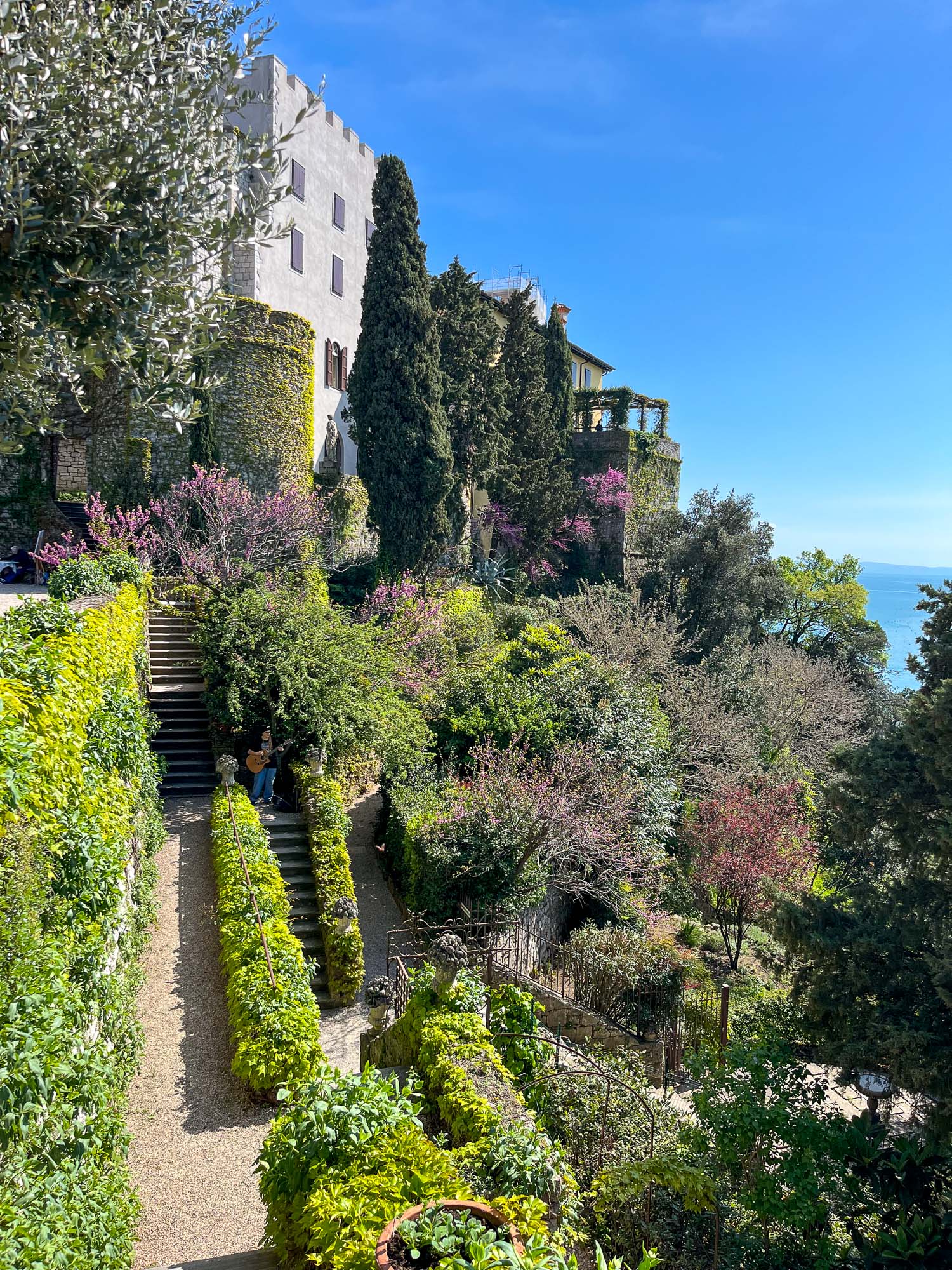 Prvotni lastniki so počasi izumrli, kasneje so grad prevzeli grofti Thurn-Valsassina in potem 1875, sedanji lastniki, Thurn und taxis (načeloma nobene zveze s taksiji, uganka se skriva v grbu – grofi stolpov in jazbecev :-)). Zgradba je masivno poslopje, sredi katerega se dviga starodavni stolp (na preteklost opominja spominska plošča iz III. stoletja po Kristusu, ki so jo postavili v spomin na obisk cesarja Dioklecijana), obkrožen pa je z ohranjenim parkom. No, od 17. stoletja je grad gostil številne ugledne goste iz kraljevih in cesarskih voda (npr. Elizabeta Avstrijska aka Sissi, habsburški nadvojvoda Maksimilijan, avstrijski nadvojvoda Franz Ferdinand, princ Charles aka angleški kralj Karel) ter tudi kulture ( Johann Strauss, Franz Liszt, Mark Twain, Rainer Maria Rilke). Verjetno najbolj povezan z gradom je prav slednji, Rilke, ki je med bivanjem na gradu zložil prvi dve od svojih Devinskih elegij, ohranjena je tudi miza, kjer naj bi sedel na balkonu in pisal ter seveda se po njemu imenuje tudi pohodna pot od Devina od Sesljana.