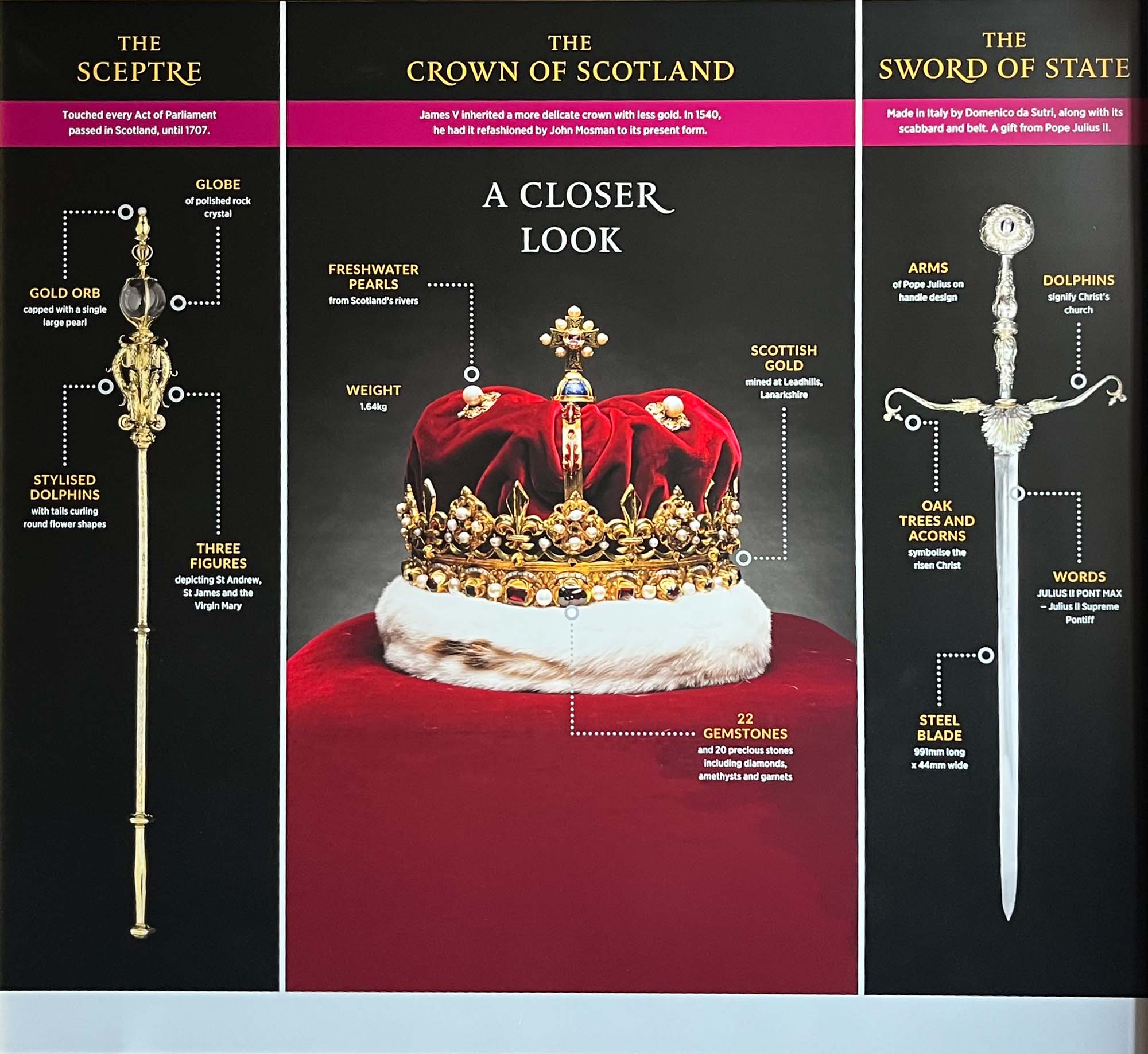 V gradu so shranjeni tudi škotski kronski dragulji in t.i. Stone of Destiny (aka Stone of Scone, nekateri mu pravijo tudi kamen usode), ki so ga škotski kralji uporabljali ob kronanju (in je bil prvotno postavljen ob palači Scone. Kamen so Angleži v 13. stoletju odnesli v Westminster, a so ga po dolgih stoletjih vrnili nazaj na Škotsko. Vsak dan ob točno 13. uri se sproži top, t.i. “One o’Clock Gun”, kar ima korenine v 19. stoletju, ko so s tem signalom ladjam v pristanišču omogočali natančno nastavitev ur.