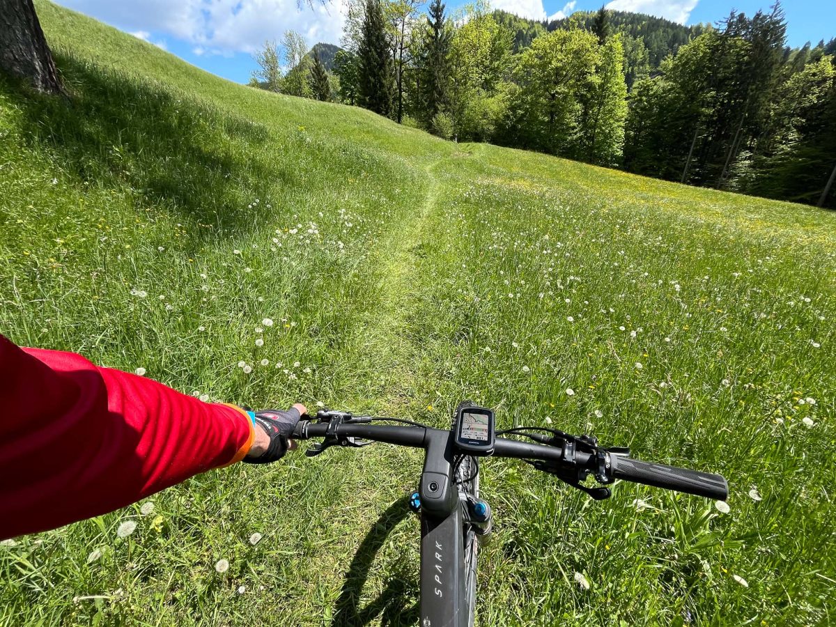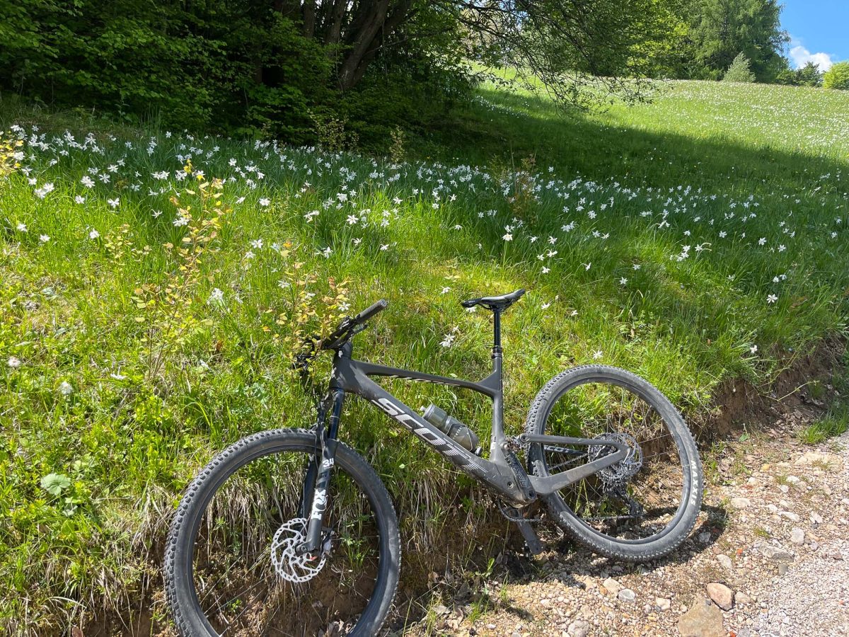 Kolesarski krog pa je bil standarden in zelo fajn. Precej vzpona (lepega in ne prestrmega), en zelo trail vložek s strmim spustom in vzponom, nazaj pa mimo Javorniškega rovta in nazaj po kolesarskih. Skupaj 42km in 1300m vzpona.