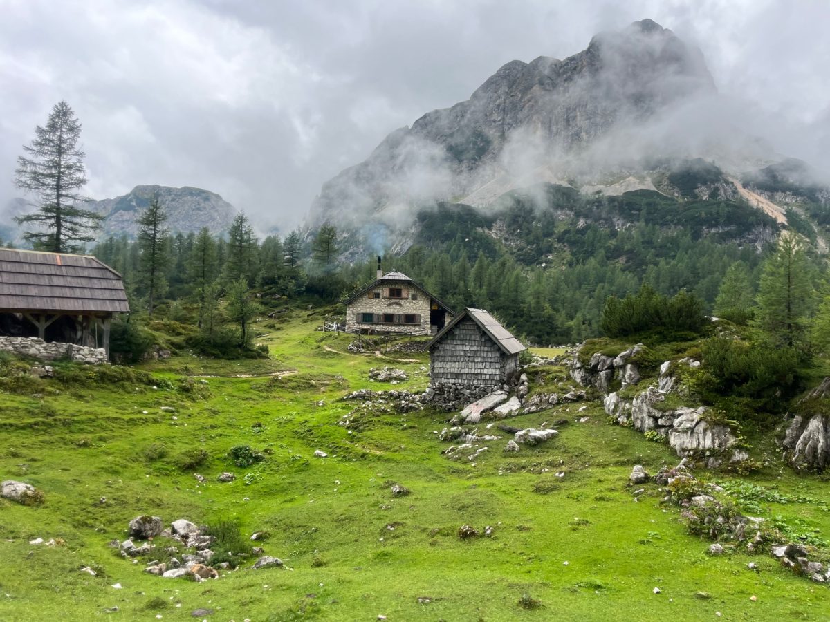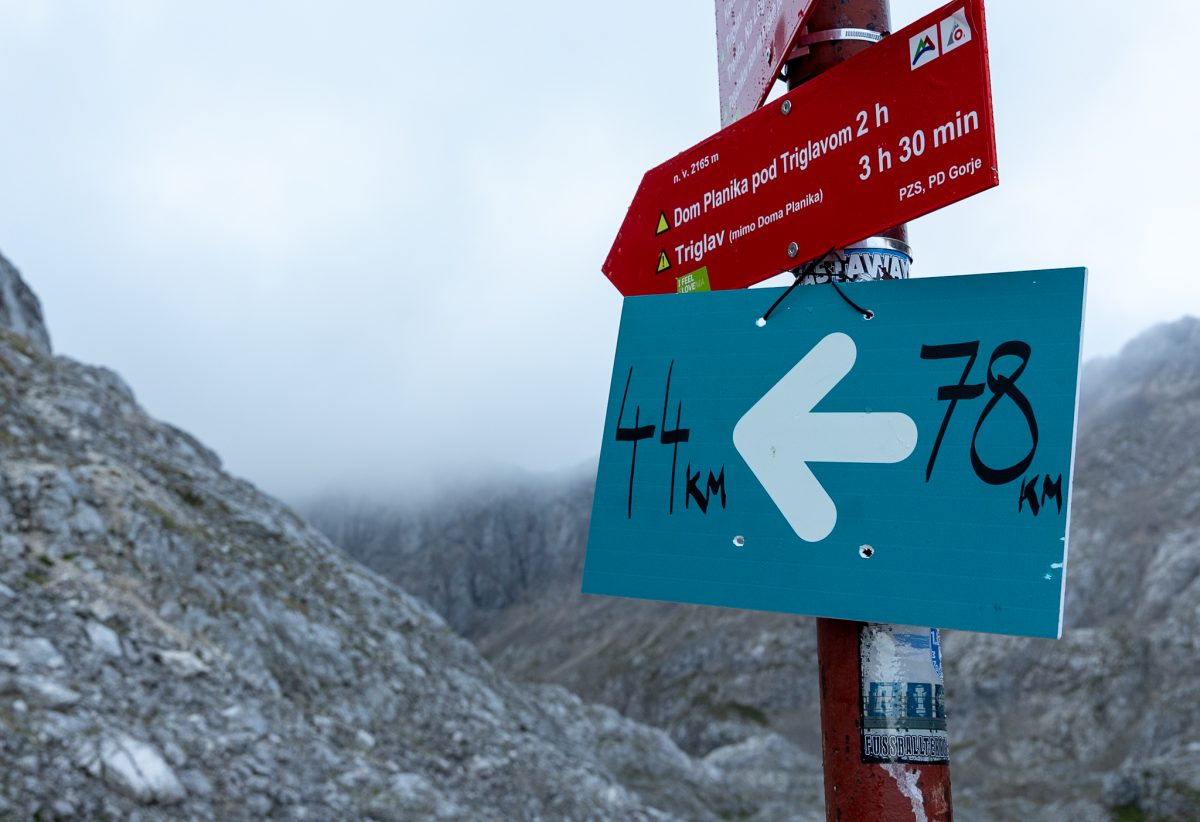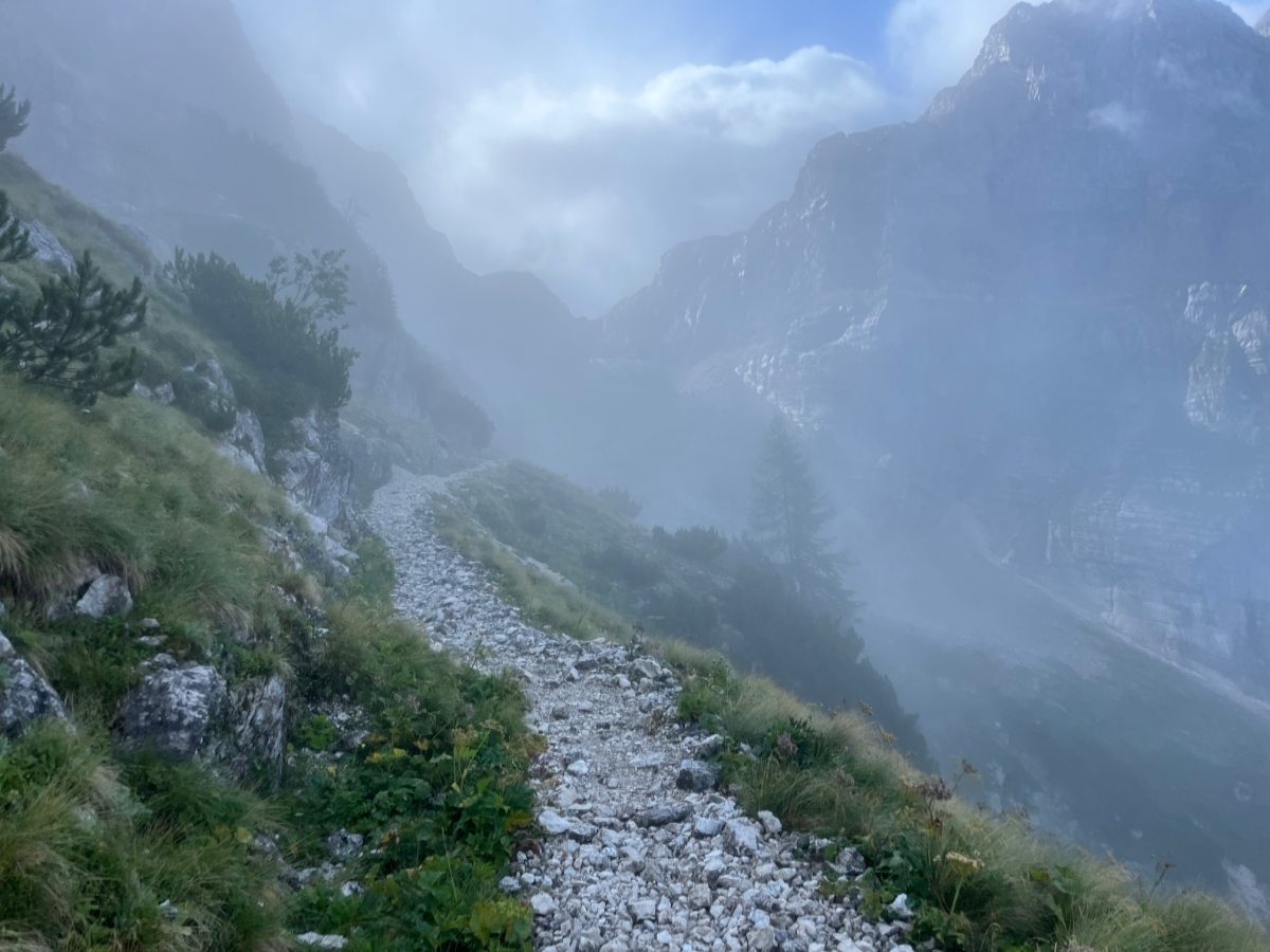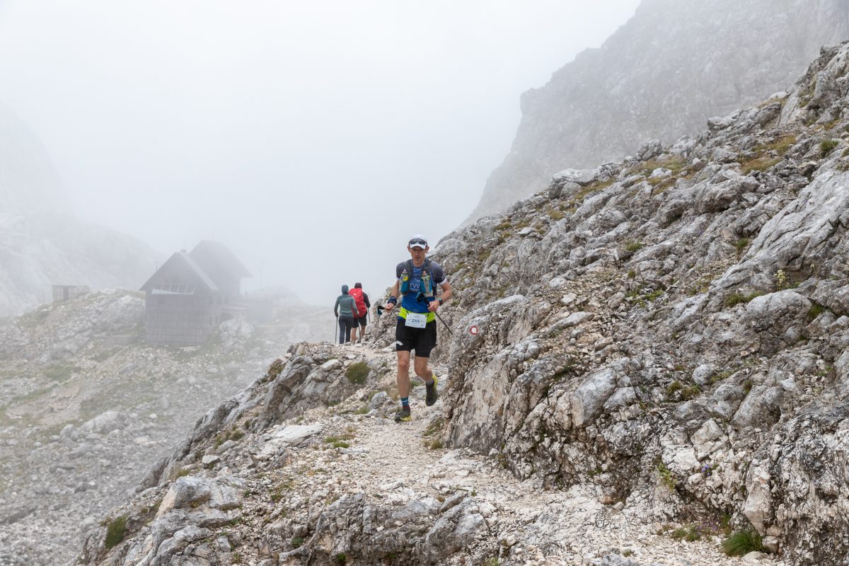 Na prvem resnejšem vzponu proti Luknji pa sem prešel v hojo in bil počasnejši od drugih – vidi se, da skoraj nikoli ne treniram resnih klancev in da je hitra hoja v hrib čisto druga disciplina kot tek po ravnem. Pogledov proti Triglavu žal ni, bližamo se meji oblakov. Ko smo na Luknji prvič stopili v oblake, je začelo deževati, a je kmalu ponehalo. Malo sem se poigraval z mislijo, da bi se oblekel, ampak se mi ni dalo ustavljati na mrazu, saj se nov vzpon začne že čez 10-15 minut. Do Luknje sem od Aljaža rabil 1h3m, kar je med 5-10 minut počasneje kot sotekači s katerimi sem začel vzpon.