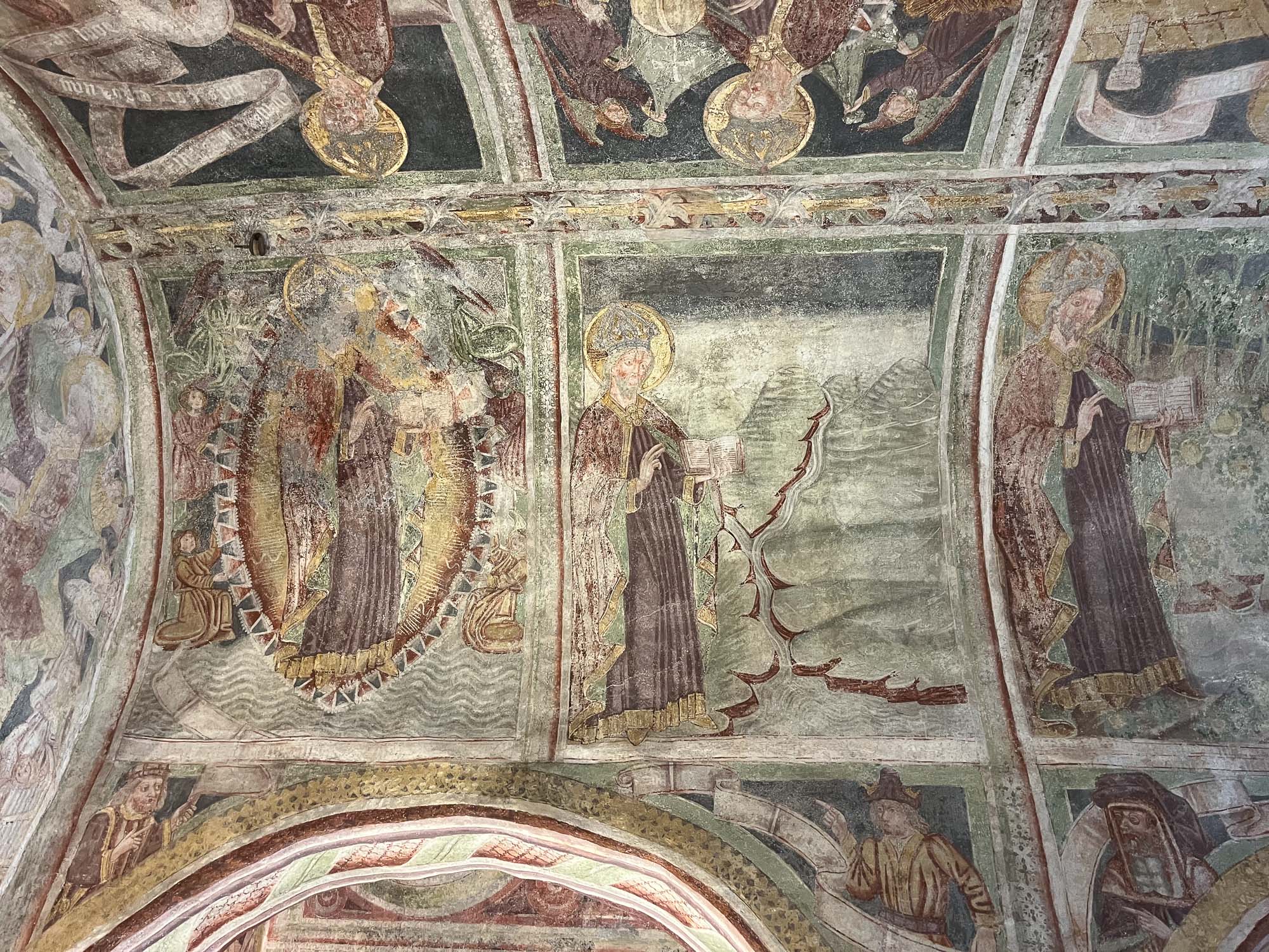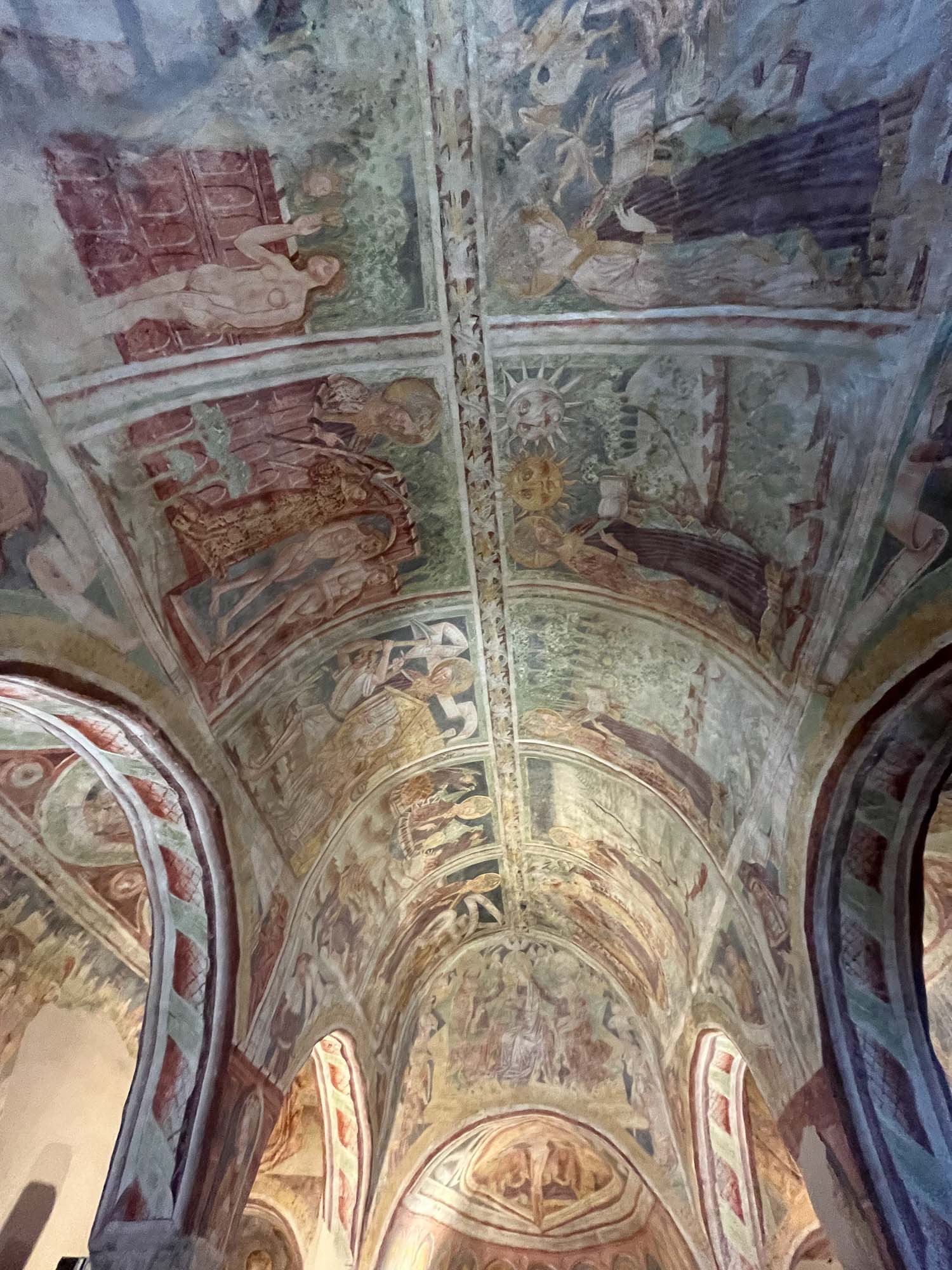 Freske so bile odkrite leta 1951, ohranile pa so se zato, ker so bile prekrite z apneno barvo (verjetno so jih prekrili med kakšno prenovo v preteklih stoletjih). Barve na stenah so originalne, freske pa super ohranjene, žal z nekaterimi belimi lisami. V cerkvi ni veliko naravne svetlobe, zato so 19. stoletju prebili lino za okno, vendar so pri tem na žalost uničili nekaj stenskih poslikav (in takrat so bile freske prekrite z apneno barvo, tako da verjetno niti niso vedeli, da kaj uničujejo).