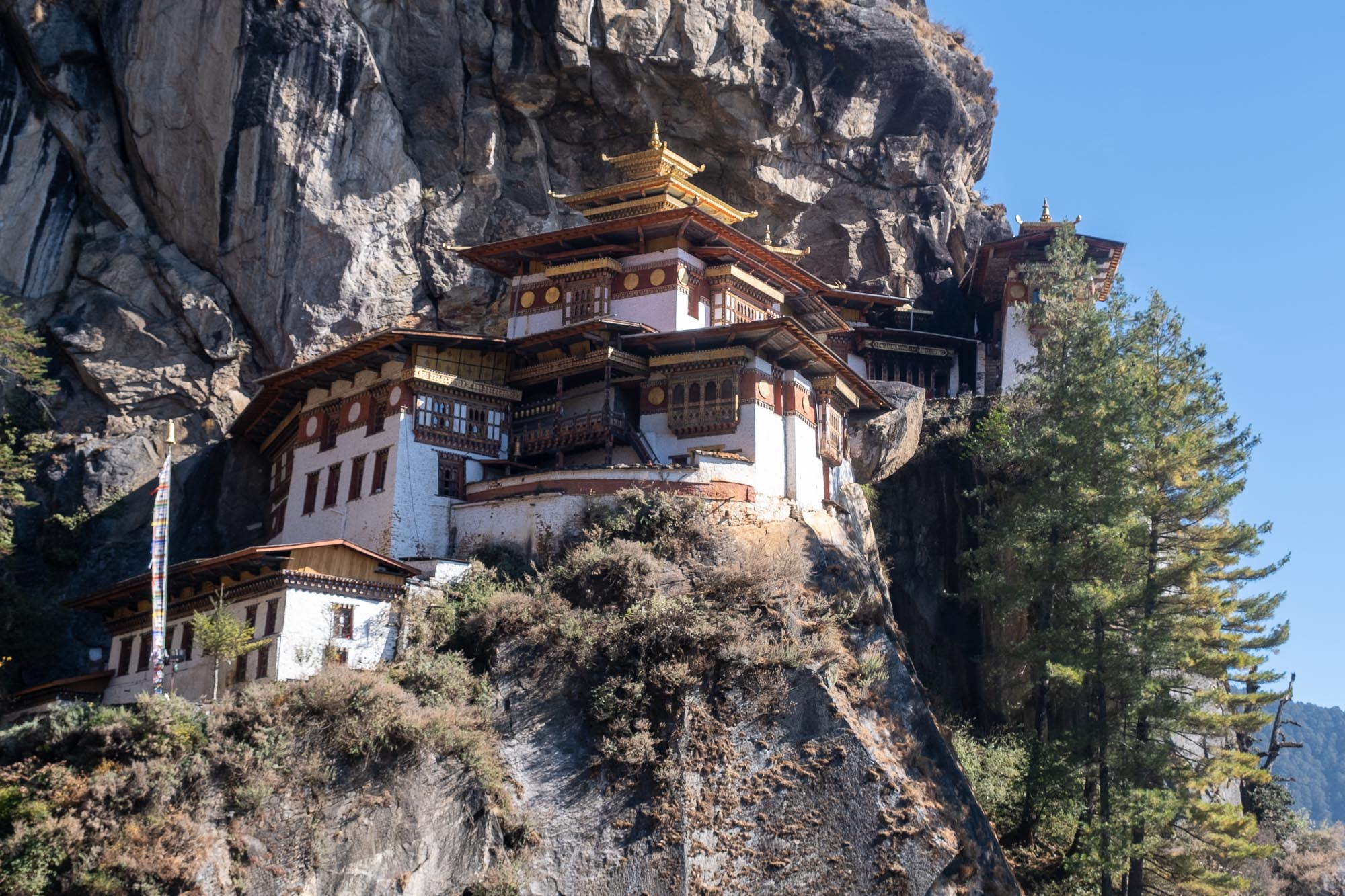 At last, it’s time for the trek to the Tiger’s Nest (Taktsang Lhakhang), the most iconic temple in Bhutan. The drive to the trailhead, which lies at around 2,400 meters above sea level, takes only about 15 minutes. The ascent itself is divided into two quite distinct sections.