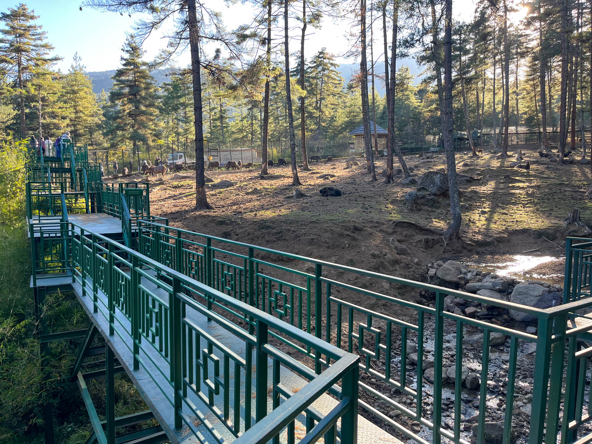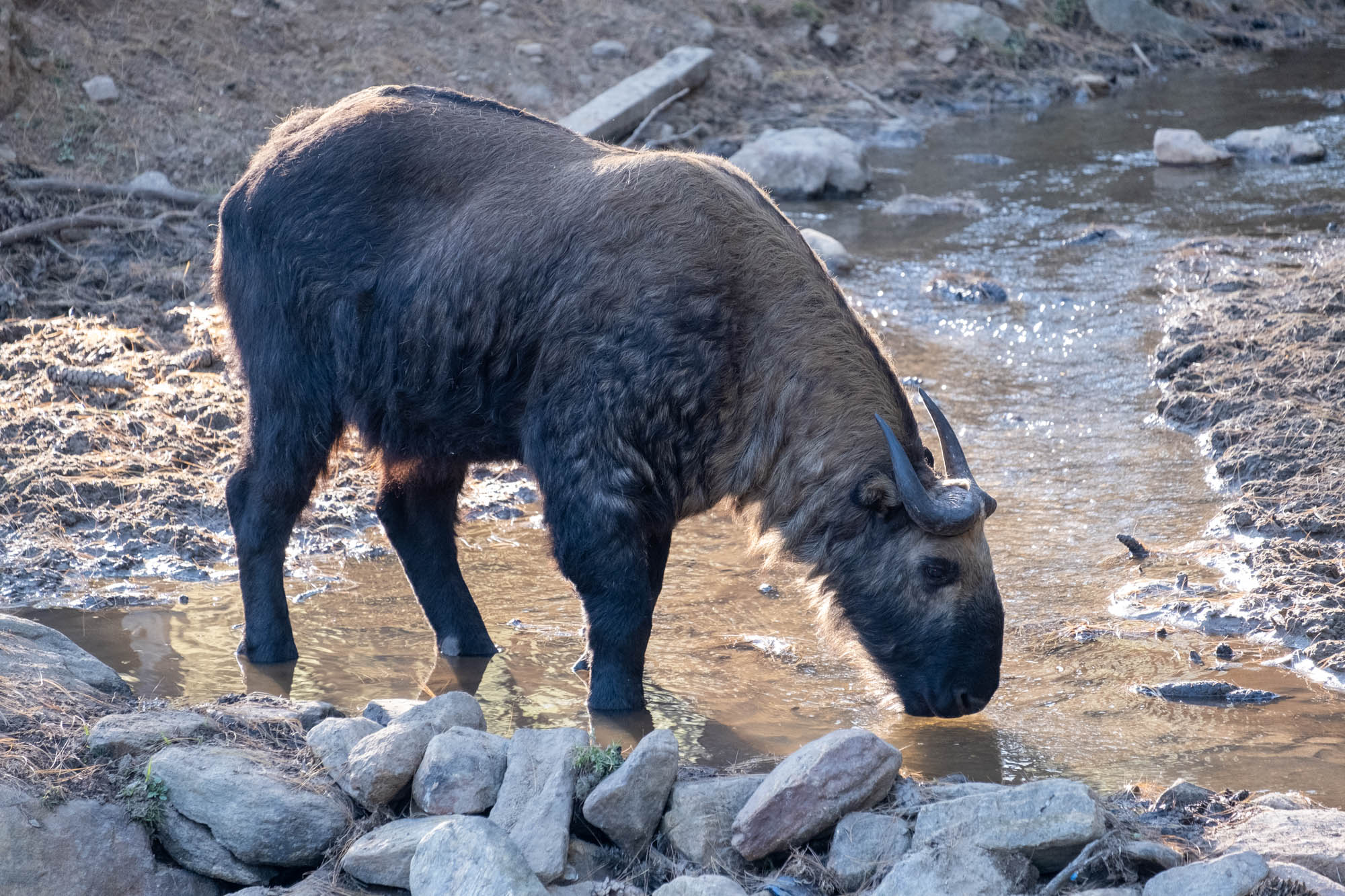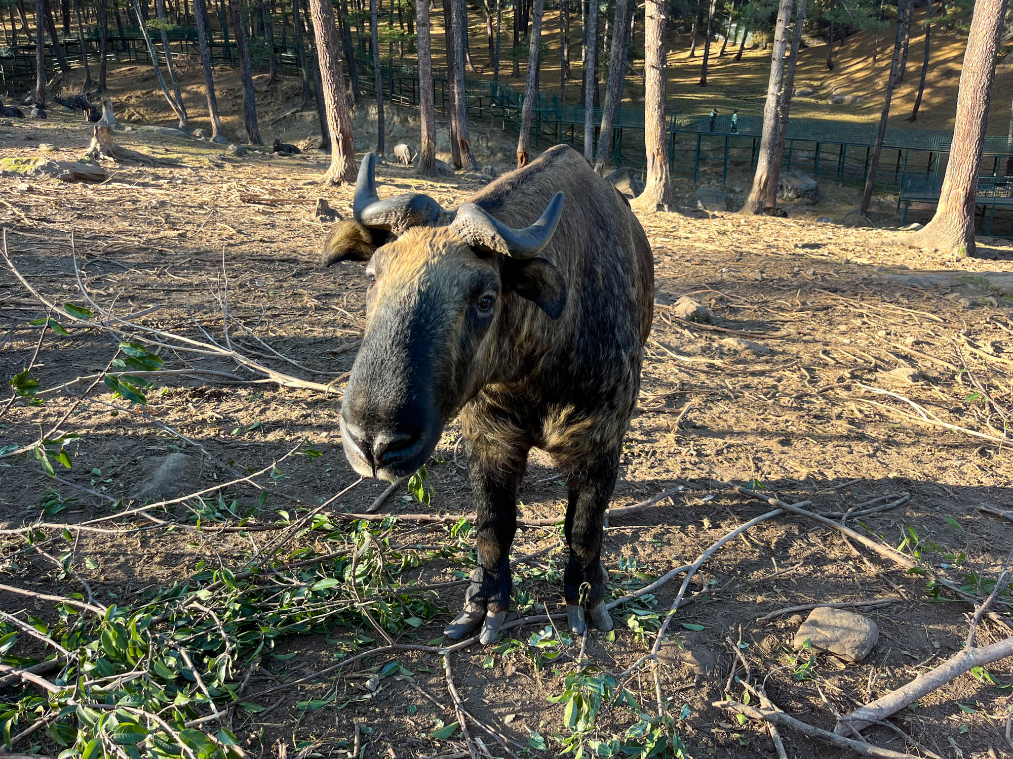 And yes, Royal Takin Reserve is one of the more unusual, yet charming stops in Thimphu. It’s a small animal reserve on a hillside above the city, home to the takin—Bhutan’s national animal, which is truly something special. At first glance it looks like a mix between a goat and an African wildebeest, with a huge nose and a completely “prehistoric” expression. And of course, there’s a story behind it too: according to legend, the takin was created by the Buddhist saint Drukpa Kunley, also known as the “Divine Madman,” who came from Tibet. After a feast, he supposedly combined the head of a goat with the body of a cow—and voilà, the takin was born. The reserve used to be a small zoo, but today it’s more of an open space where the animals live in a fairly natural environment, surrounded by forest and bamboo. Besides takins, there are also a few deer and other animals wandering around, but the takin is obviously the star of the show.